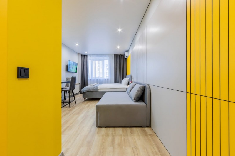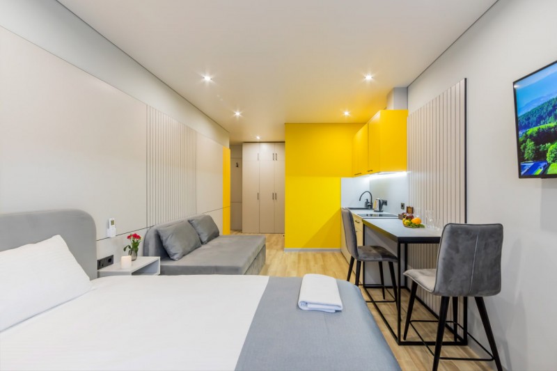 Современные апартаменты-студии с новым дизайнерским ремонтом в стильных серо-желтых тонах создают атмосферу комфорта и уюта. Апартаменты находятся недалеко от метро "Святошин". В студии есть большая кровать с ортопедическим матрасом, кондиционер, телевизор, высокоскоростной Wi-Fi, полностью укомплектованная кухня и современная душевая комната. Идеальный вариант для комфортного отдыха после насыщенного дня – как для путешествий, так и для продолжительного проживания.