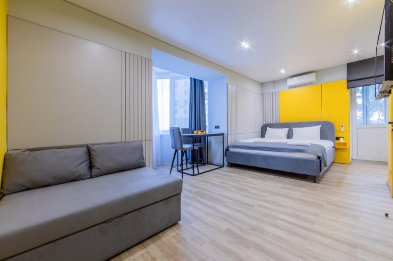 Современные апартаменты-студии с новым дизайнерским ремонтом в стильных серо-желтых тонах создают атмосферу комфорта и уюта. Апартаменты находятся недалеко от метро "Святошин". В студии есть большая кровать с ортопедическим матрасом, кондиционер, телевизор, высокоскоростной Wi-Fi, полностью укомплектованная кухня и современная душевая комната. Идеальный вариант для комфортного отдыха после насыщенного дня – как для путешествий, так и для продолжительного проживания.