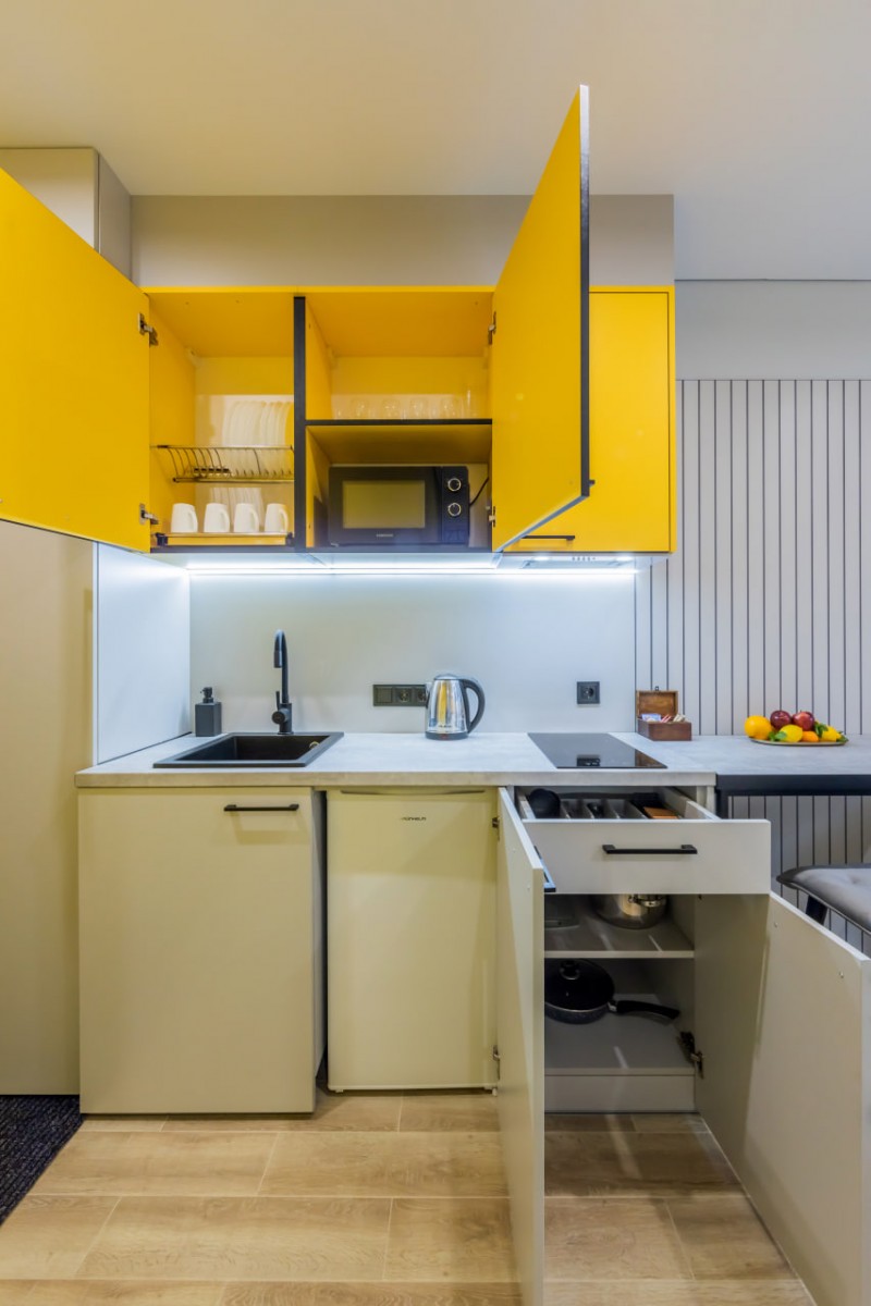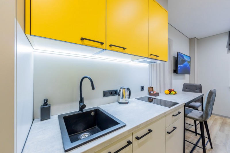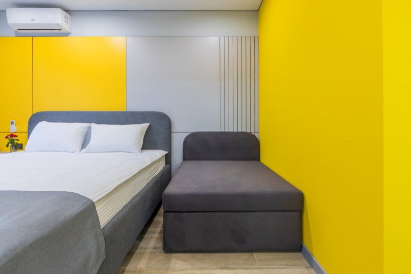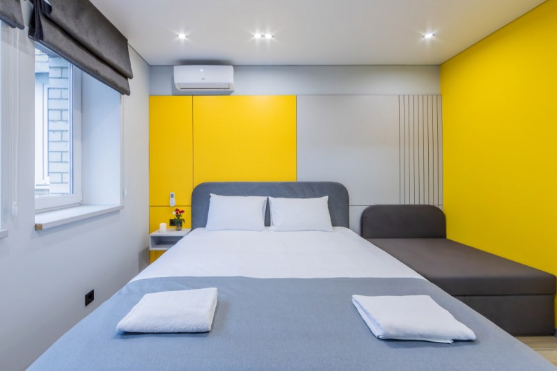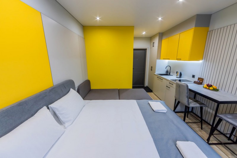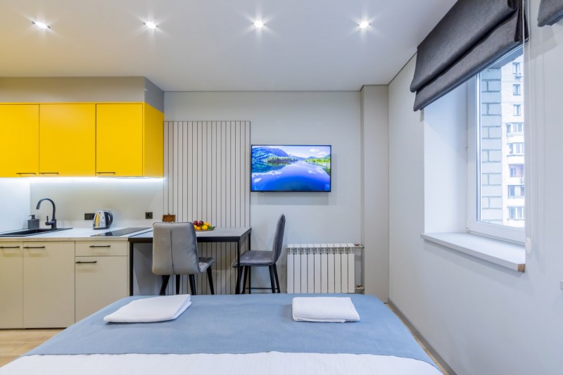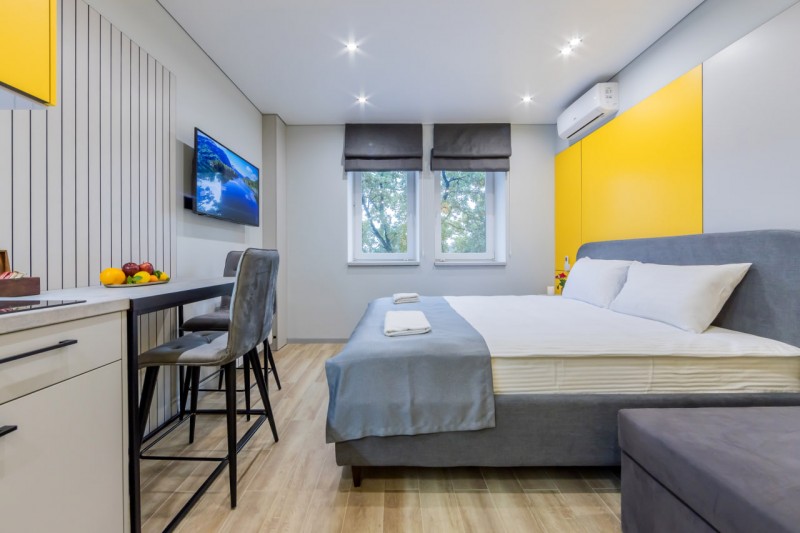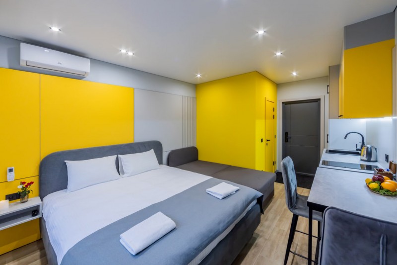 Сучасні квартири-студії з новим дизайнерським ремонтом у стильних сіро-жовтих тонах створюють атмосферу затишку та комфорту. Апартаменти знаходяться неподалік метро "Святошин". У студії є велике ліжко з ортопедичним матрасом, кондиціонер, телевізор, швидкісний Wi-Fi, повністю укомплектована кухня та сучасна душова кімната. Ідеальний варіант для комфортного відпочинку після насиченого дня — як для подорожей, так і для тривалого проживання.
