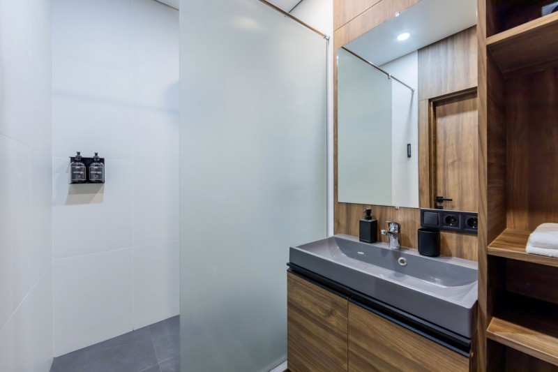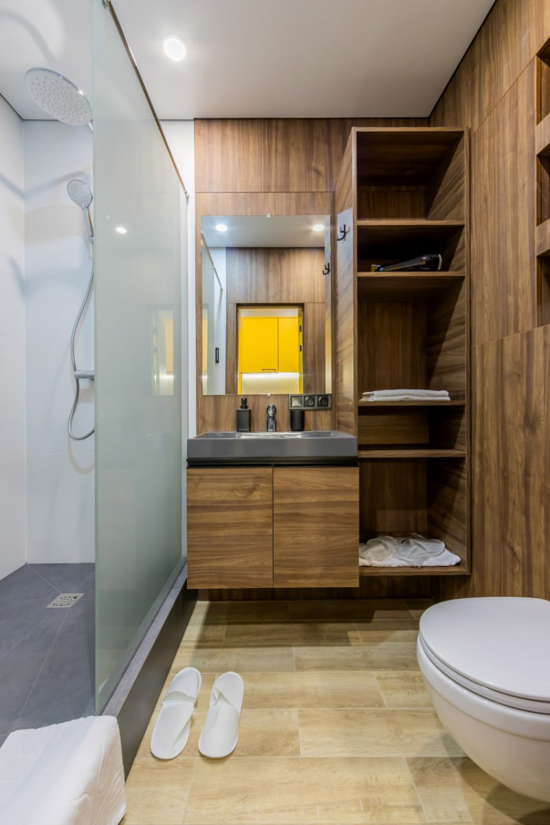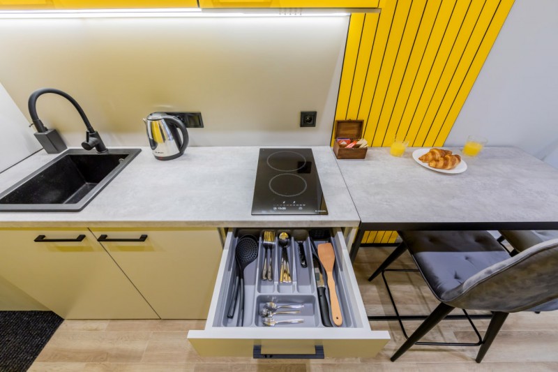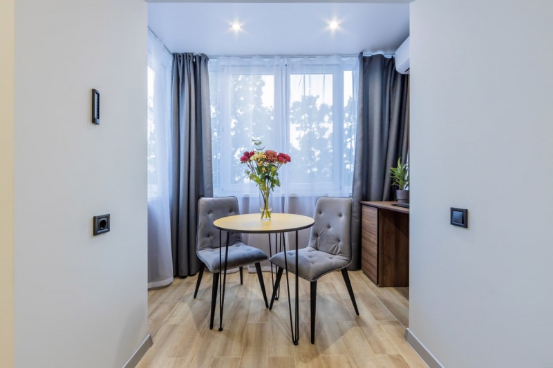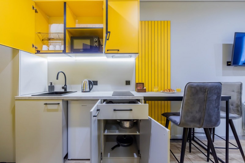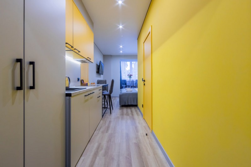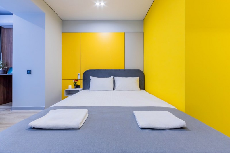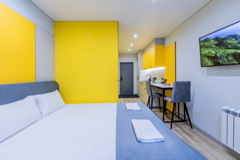 Сучасні квартири-студії з новим дизайнерським ремонтом у стильних сіро-жовтих тонах створюють атмосферу затишку та комфорту. Апартаменти знаходяться неподалік метро "Святошин". У студії є велике ліжко з ортопедичним матрасом, кондиціонер, телевізор, швидкісний Wi-Fi, повністю укомплектована кухня та сучасна душова кімната. Ідеальний варіант для комфортного відпочинку після насиченого дня — як для подорожей, так і для тривалого проживання.